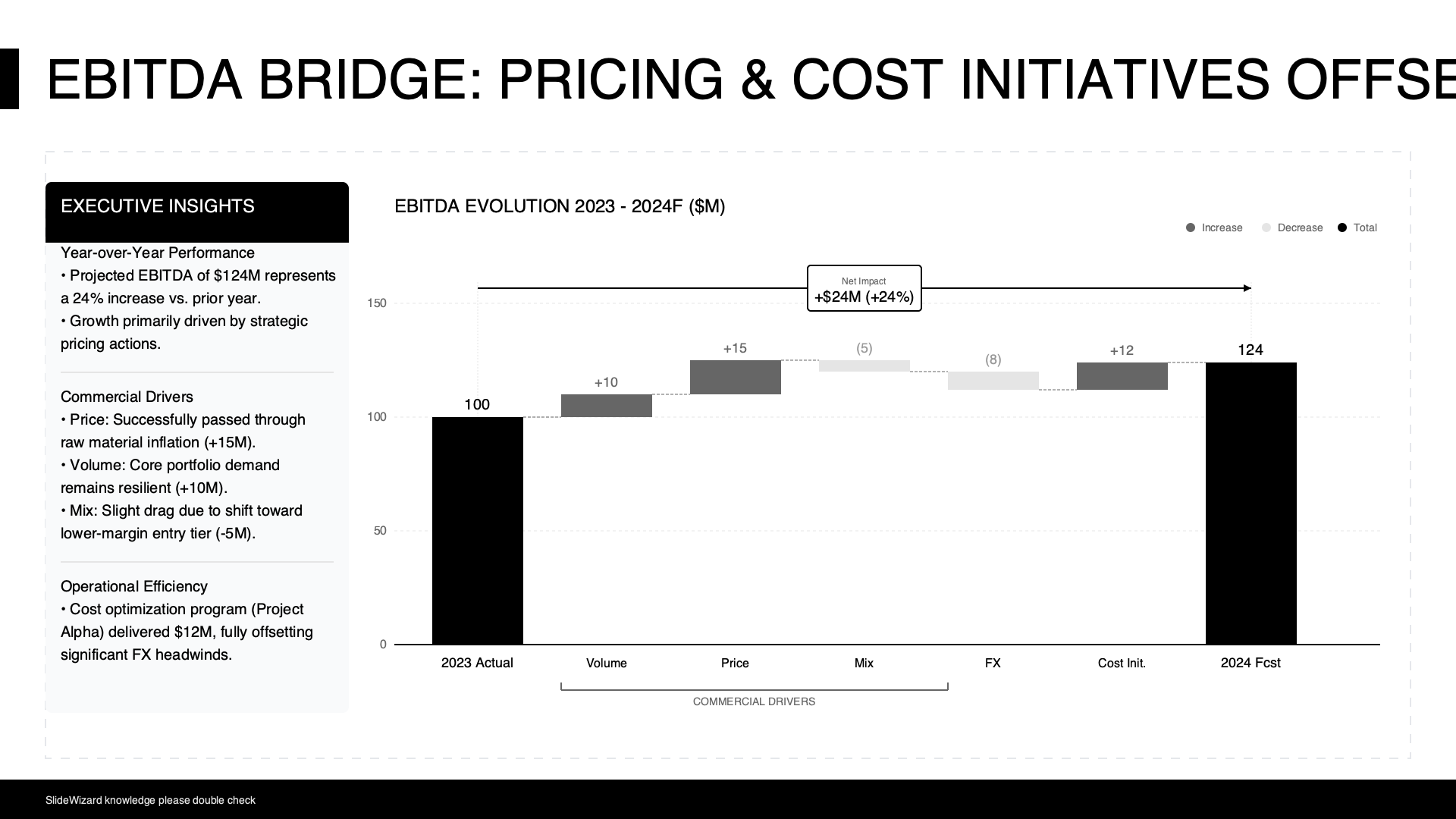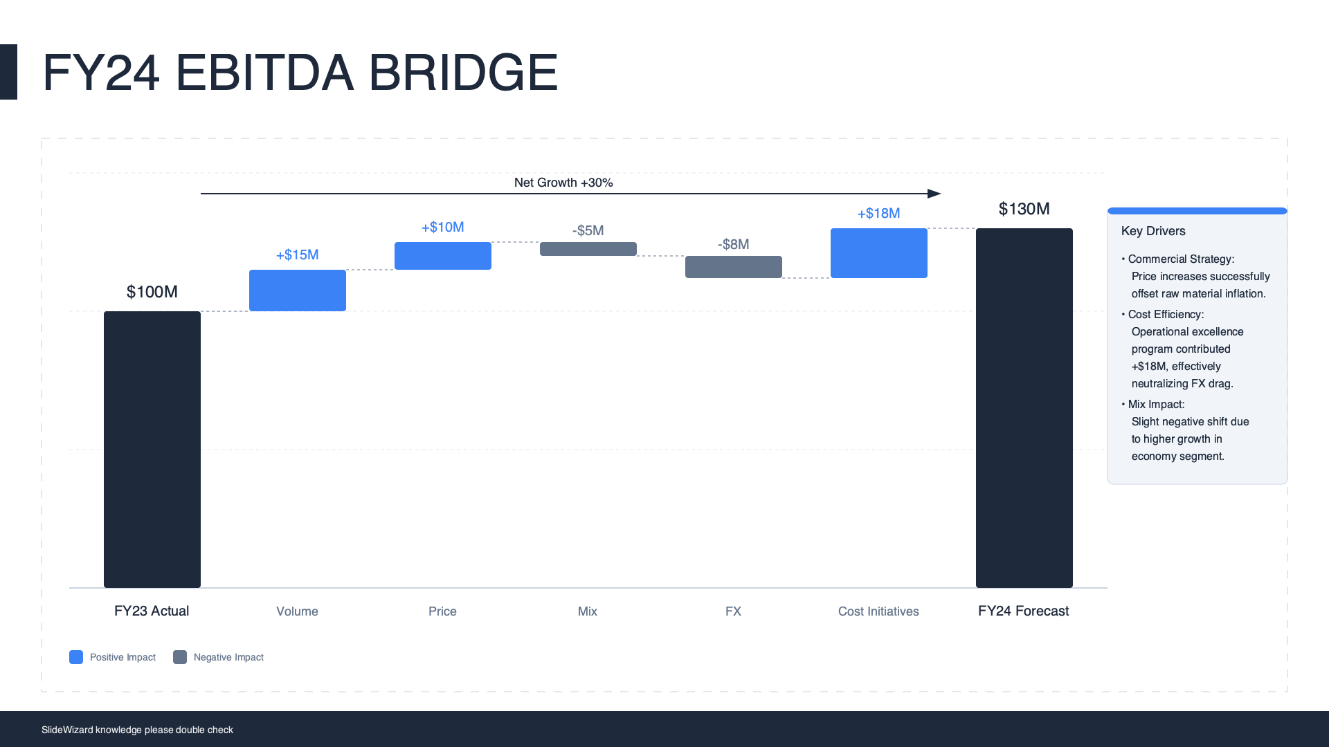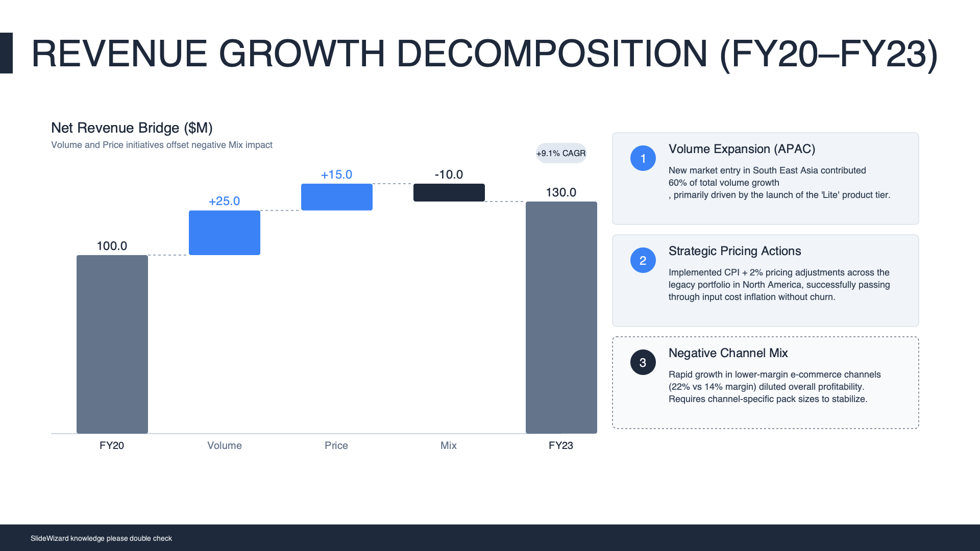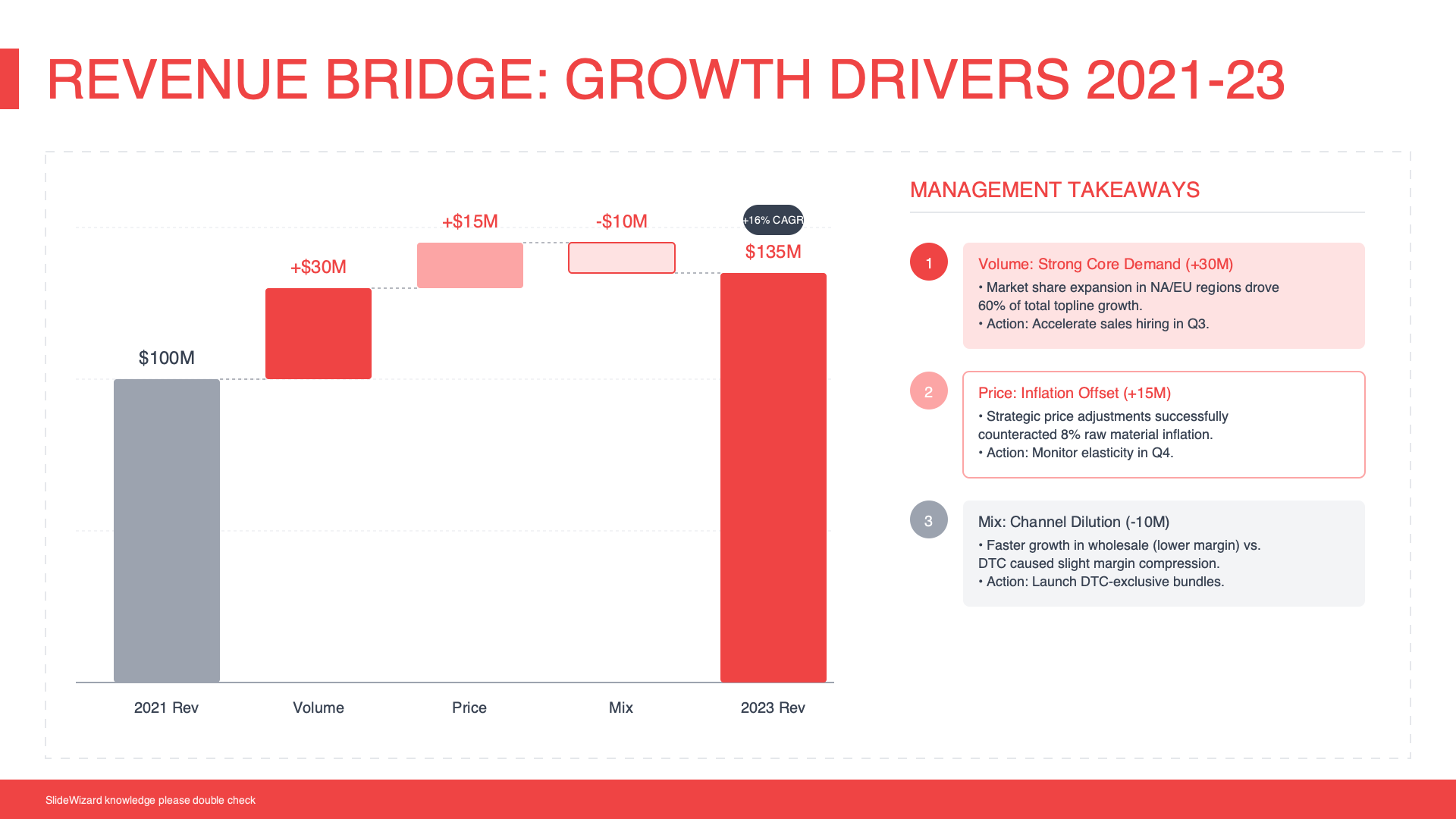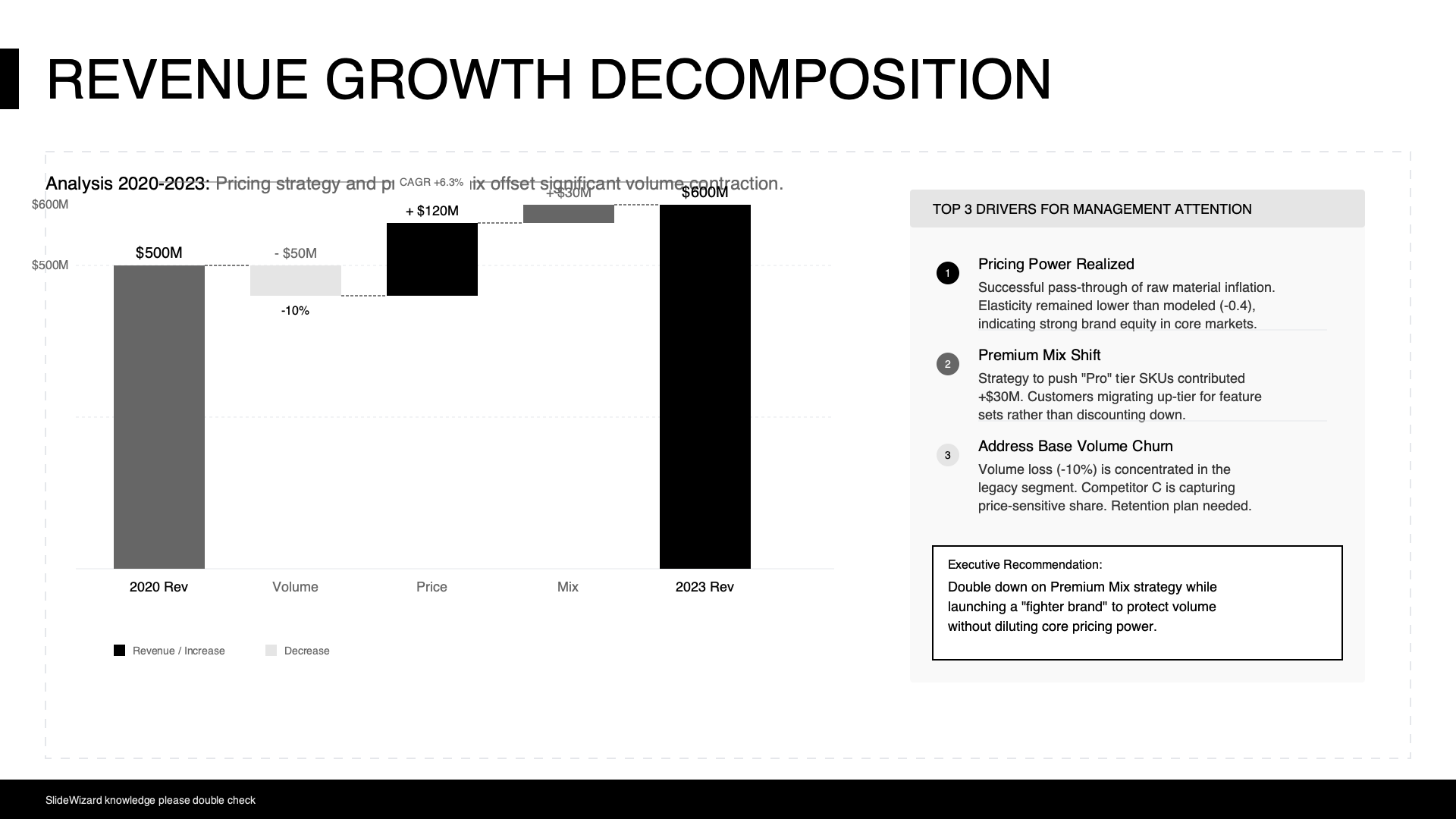 "Prepare a single slide that decomposes our revenue growth over the last 3 years into volume, price, and mix effects, and clearly highlights the top 3 drivers management should care about."